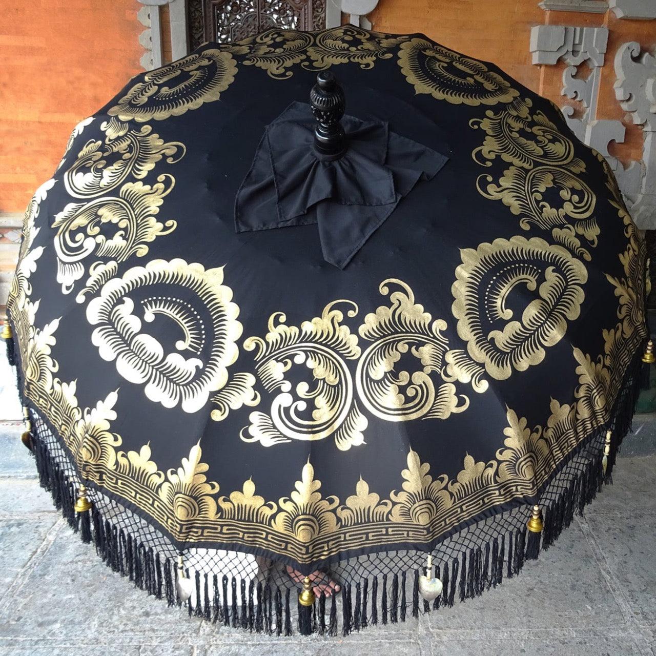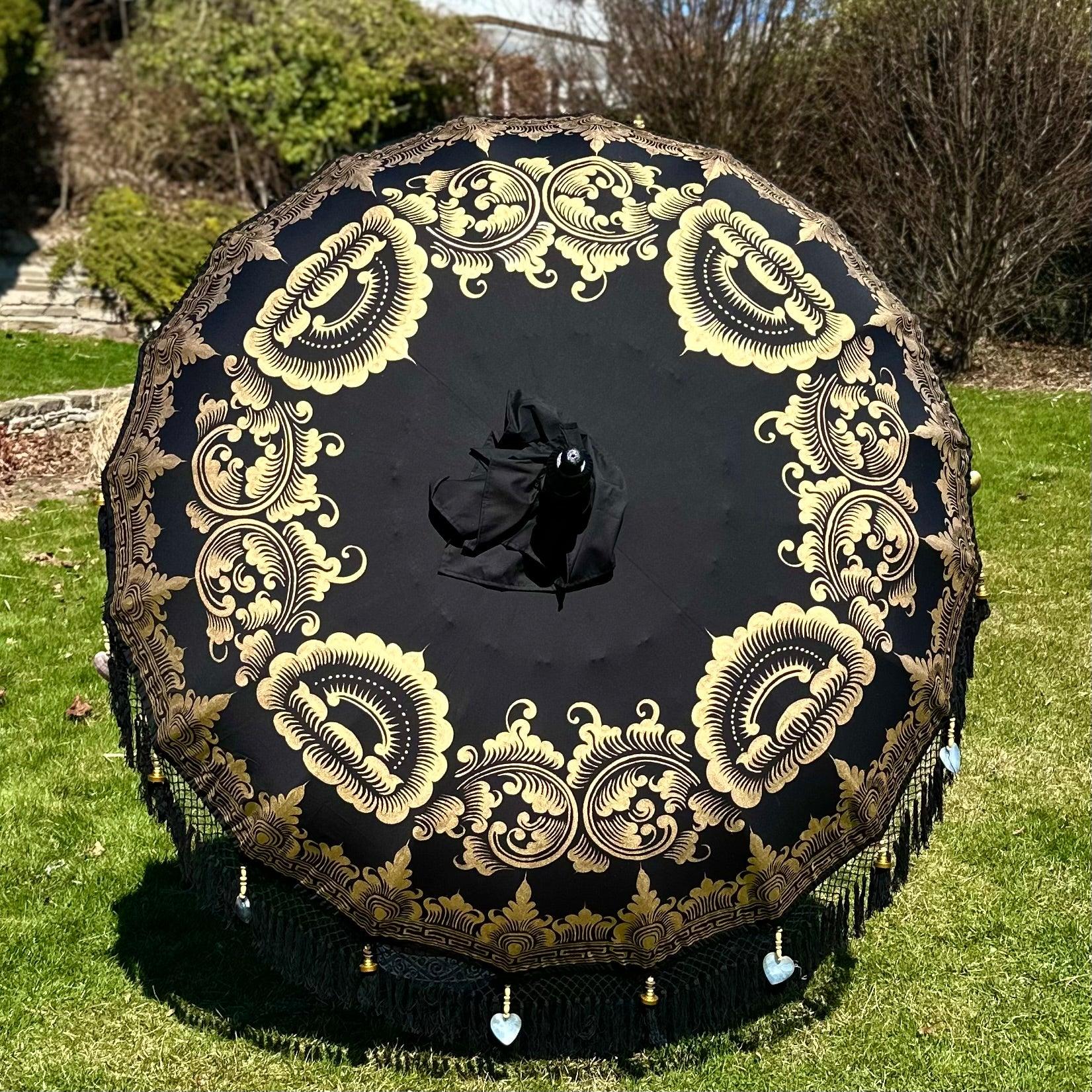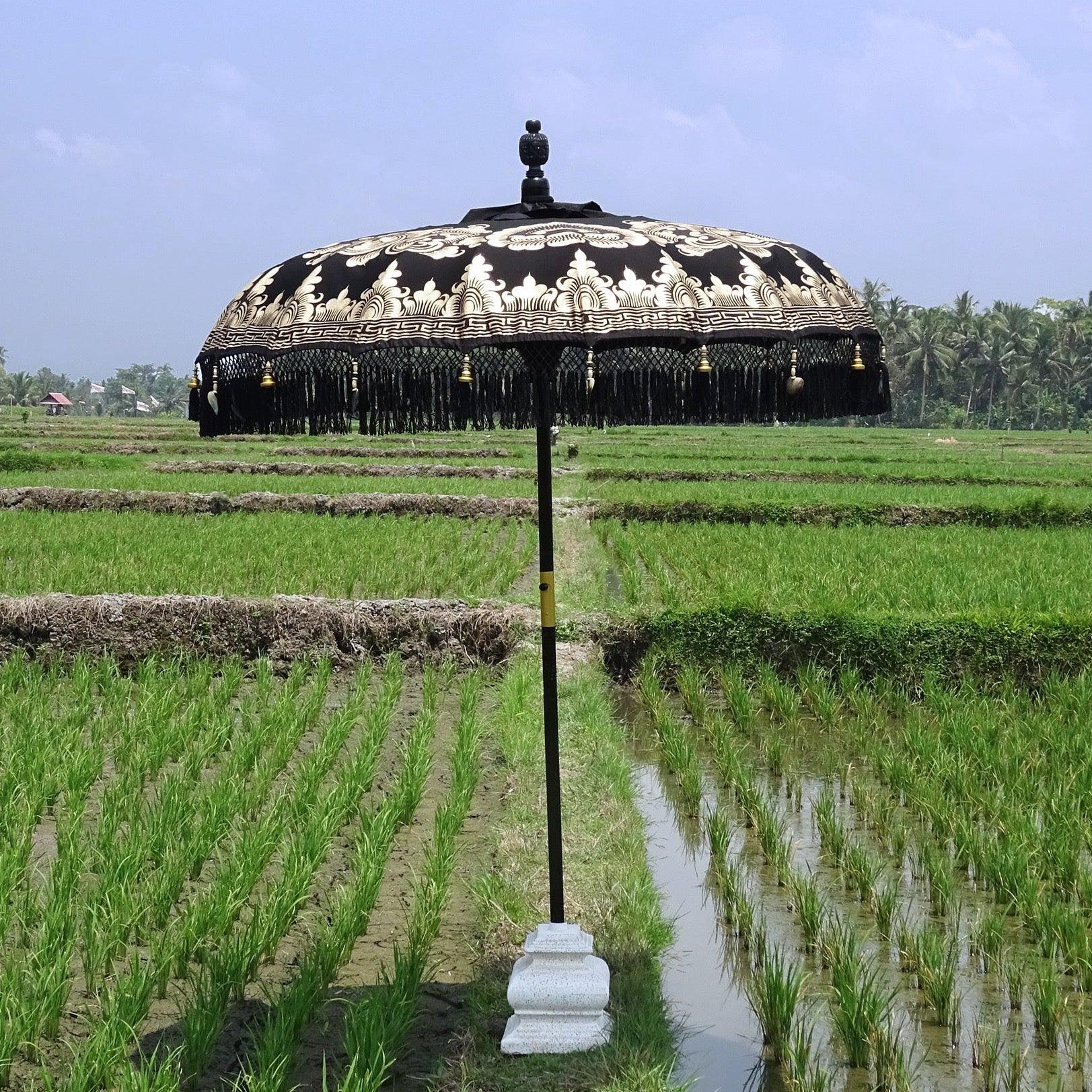 The Carl Parasol feature an all-black hue adorned with gold ink, creating a captivating aesthetic. The pole is hand-carved with durian wood and has a solid brass accent, while the foundation is supported by bamboo spokes. Light and portable, it’s simple to set up and store, with each parasol coming with its own cotton bag. Not only is this umbrella eye-catching, but it is also practical and sure to be a stylish addition to any space.