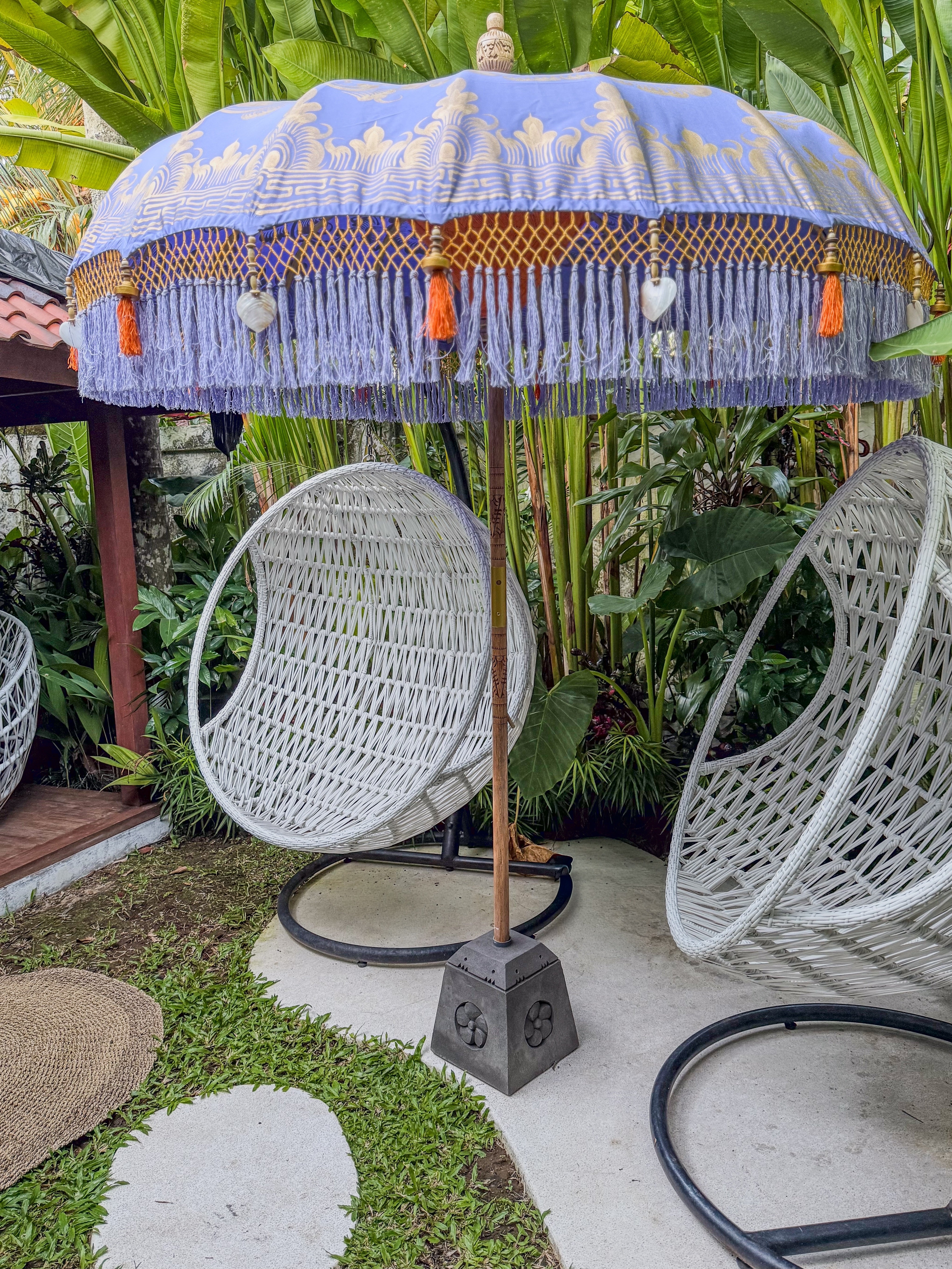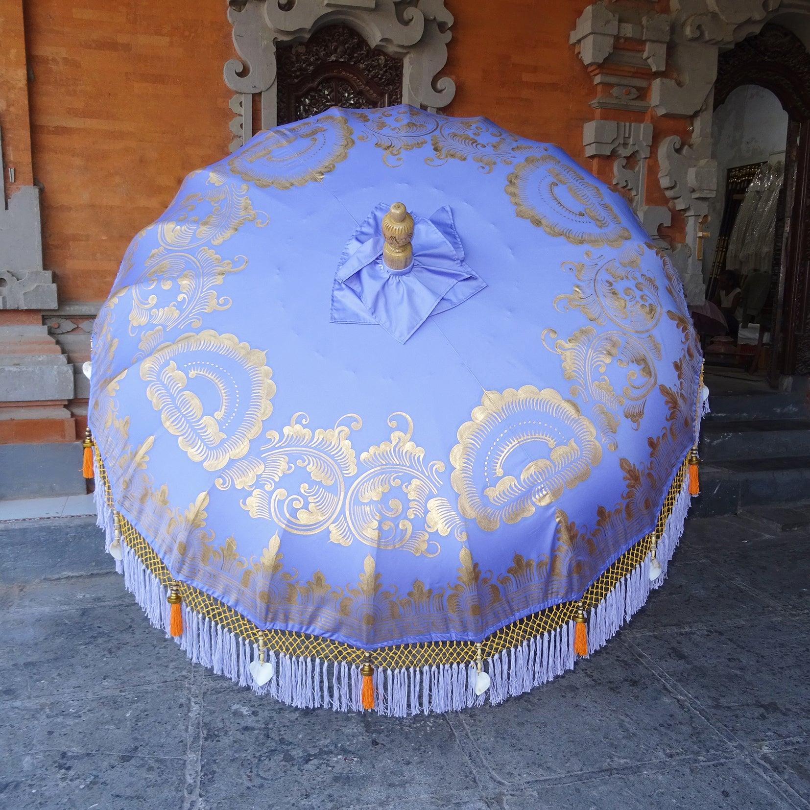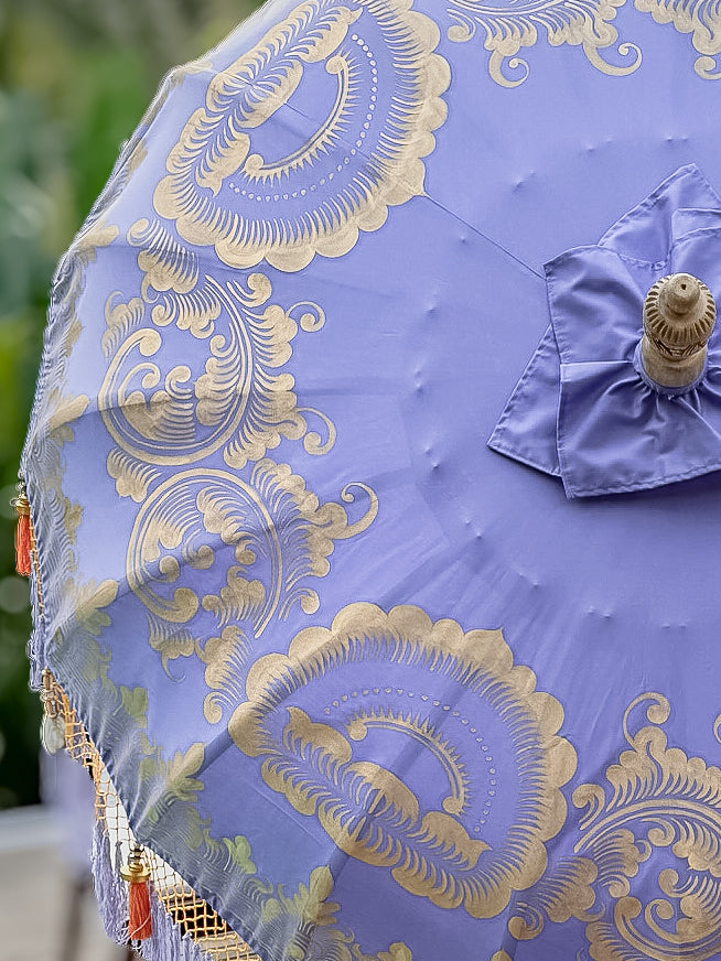 Elevate your outdoor ambiance with the Charlotte Parasol, a luxurious blend of traditional Balinese craftsmanship and contemporary elegance. Its lavender canopy is beautifully hand-painted with intricate gold designs, complemented by a vibrant orange macramé fringethat adds texture and charm.