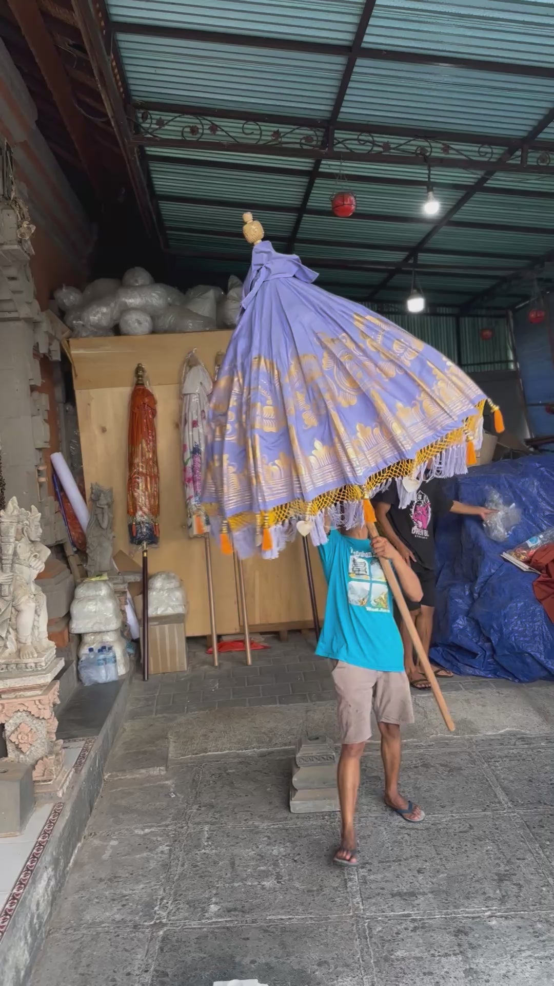 The hand-carved durian wood pole, detailed with gold-painted accents and solid brass fittings, reflects exquisite attention to detail. Inside, the parasol features meticulously handwoven orange threading, showcasing artisan skill in every piece.