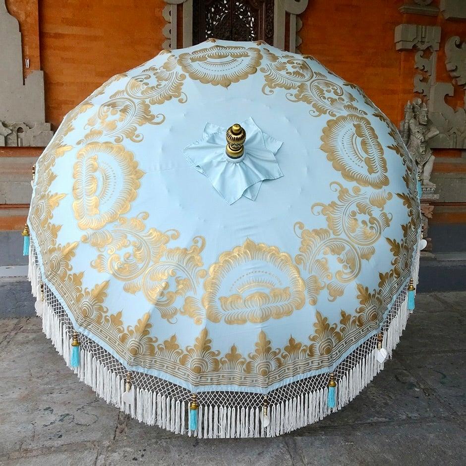 Georgie Balinese Parasol features a gold hand-painted design on light blue canvas with light blue inner threading and white outer fringe, adorned with light blue tassels, gold and wooden beading, and heart-shaped seashells.