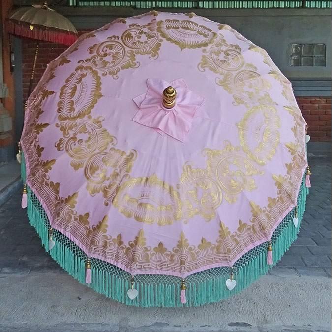 Introducing the Pink Celebrity Balinese Parasol, the perfect addition to any outdoor space in need of a touch of luxury. The parasol is handcrafted with the utmost attention to detail and features a classic white canvas with a gold hand-painted design, that will make you feel like a celebrity. The green inner threading and outer fringe, adorned with pink tassels, gold and wooden beading, and heart-shaped seashells give it a unique and striking look.